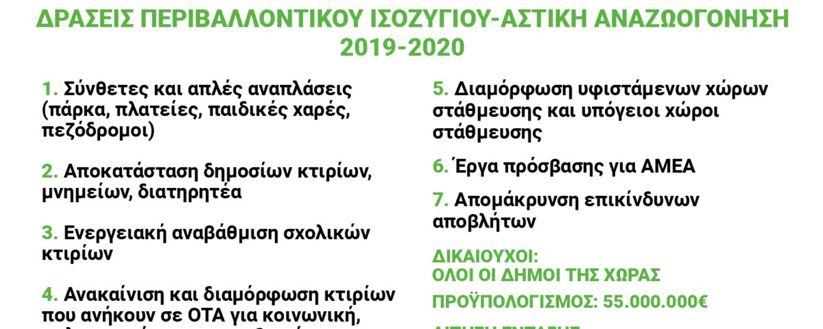 | Ειδικές πληροφορίες : | – Η πρόσκληση είναι η πρώτη από τις δύο προβλεπόμενες στο πλαίσιο του ολοκληρωμένου χρηματοδοτικού προγράμματος «Δράσεις Περιβαλλοντικού Ισοζυγίου» του άξονα προτεραιότητας «Αστική Αναζωογόνηση» για τα έτη 2019 – 2020. Η δεύτερη Πρόσκληση αναμένεται να εκδοθεί μέσα στο πρώτο εξάμηνο του 2020. – Στους δυνητικούς δικαιούχους παρέχεται επίσης η δυνατότητα υποβολής προς ένταξη ήδη συμβασιοποιημένων έργων ή έργων των οποίων έχει ολοκληρωθεί η διαδικασία δημοπράτησης και καλύπτουν τα κριτήρια της επιλεξιμότητας – Κάθε Δήμος μπορεί να υποβάλλει έως δύο (2) προτάσεις στο ίδιο Μέτρο – Κάθε Δήμος δύναται να υποβάλλει αίτημα χρηματοδότησης για ένταξη σε ένα μόνο από τα Μέτρα του προγράμματος -Χωρικό πεδίο εφαρμογής του χρηματοδοτικού προγράμματος. είναι οι πόλεις και οικισμοί με εγκεκριμένο ρυμοτομικό σχέδιο ή οικισμοί οριοθετημένοι με πράξη της διοίκησης στερούμενων εγκεκριμένου ρυμοτομικού σχεδίου. Το πρόγραμμα δεν χρηματοδοτεί δράσεις σε περιοχές εκτός σχεδίου ή εκτός ορίων οικισμών |