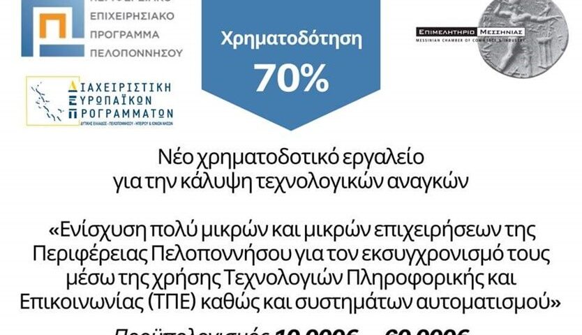 Ενίσχυση νέων και υφιστάμενων πολύ μικρών και μικρών επιχειρήσεων της Περιφέρειας Πελοποννήσου για την κάλυψη των τεχνολογικών τους αναγκών με τη χρήση Τεχνολογιών Πληροφορικής και Επικοινωνίας (ΤΠΕ) ή/και με την ενσωμάτωση συστημάτων αυτοματισμού.