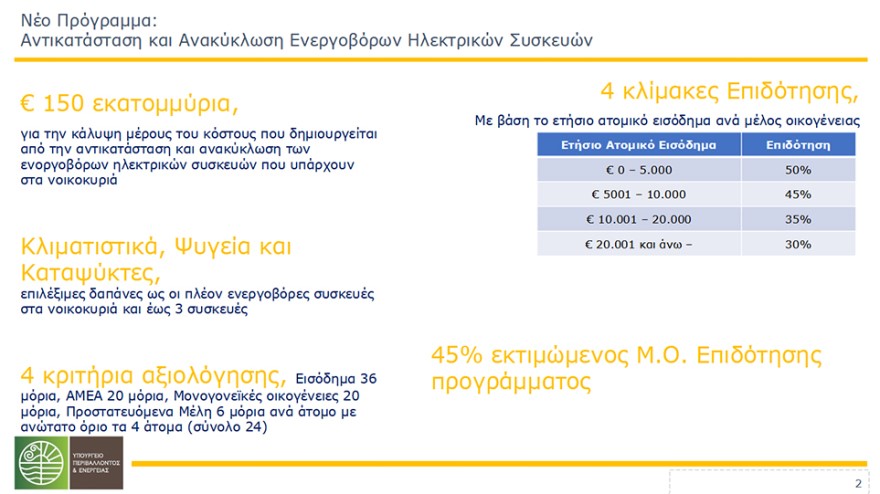 Σύμφωνα με τον υπουργό Περιβάλλοντος και Ενέργειας κ. Κώστα Σκρέκα, η επιδότηση θα ανέλθει από 30% έως 50% με βάση εισοδηματικά κριτήρια και θα κυμανθεί από τα 135 ευρώ έως τα 710 ευρώ.