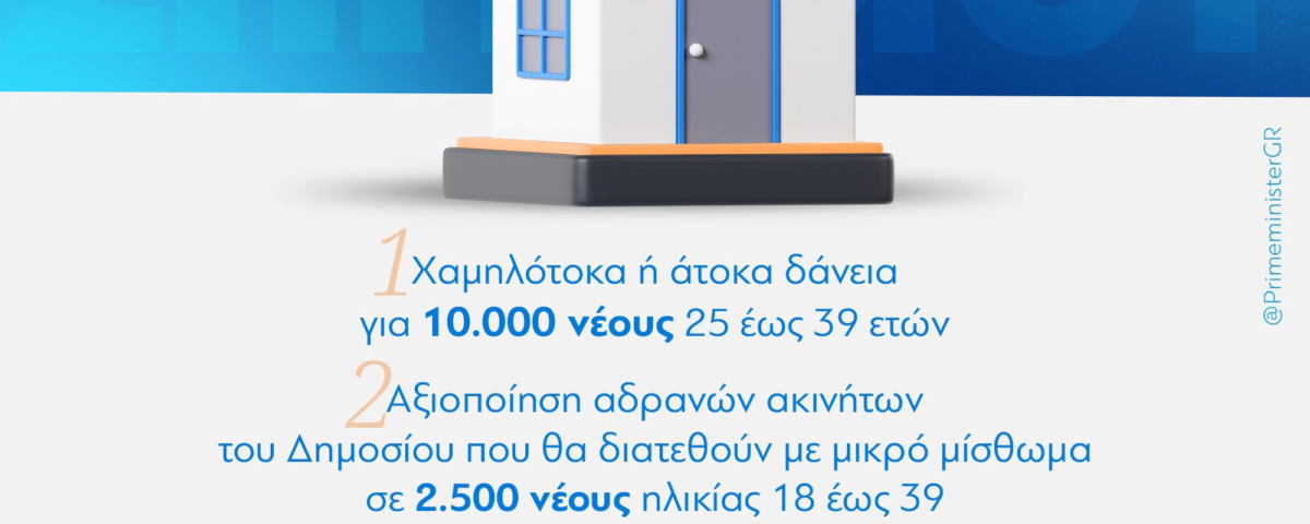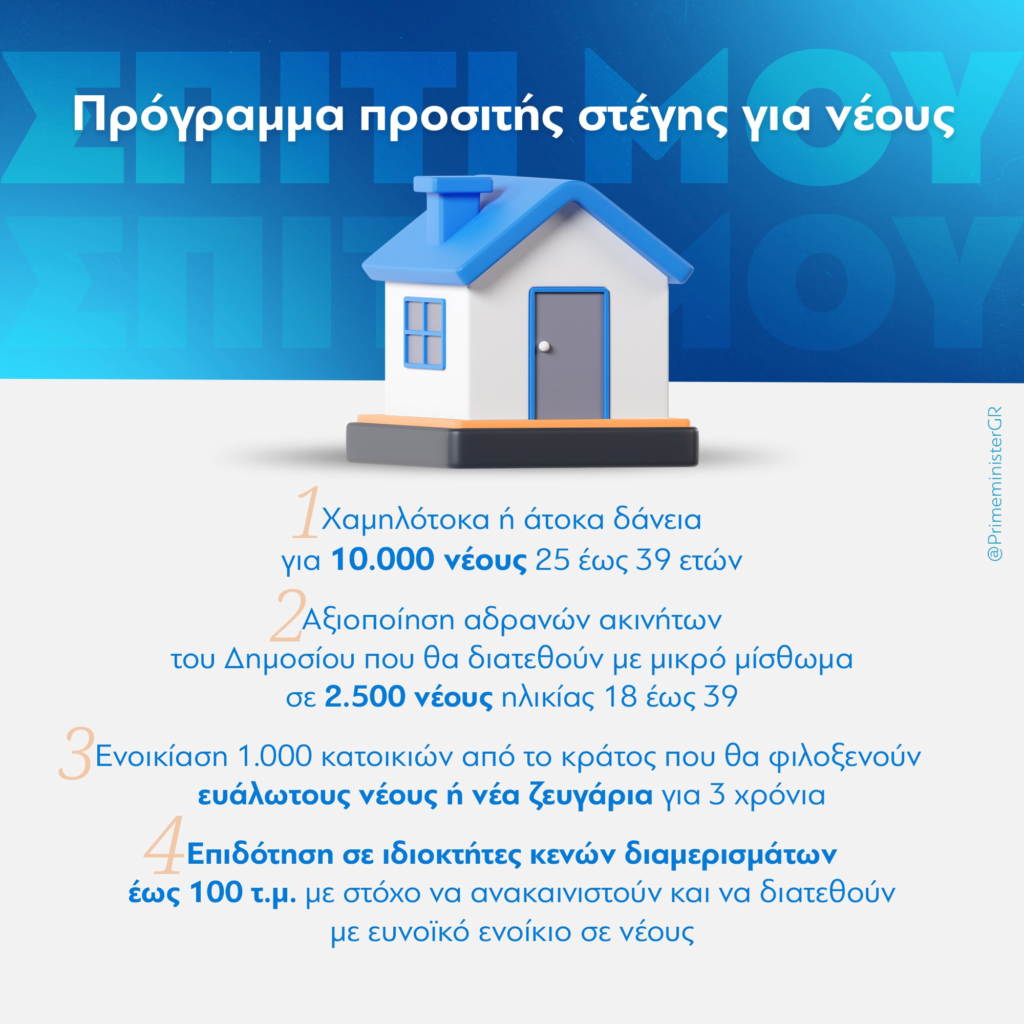 Πρώτον, με χαμηλότοκα ή άτοκα τραπεζικά δάνεια που συγχρηματοδοτεί κατά 3/4 το κράτος προς 10.000 συμπολίτες μας 25 έως 39 ετών. Χάρη στην κρατική συμμετοχή το επιτόκιο θα είναι σταθερά κατά 75% φθηνότερο από τα αντίστοιχα εμπορικά επιτόκια. Μια πολύ σημαντική βοήθεια ειδικά στο σημερινό περιβάλλον ανοδικών επιτοκίων. Έτσι οι δικαιούχοι θα καταβάλλουν για το δικό τους πλέον σπίτι μηνιαία δόση χαμηλότερη του ενοικίου που θα πλήρωναν για ένα αντίστοιχο διαμέρισμα.