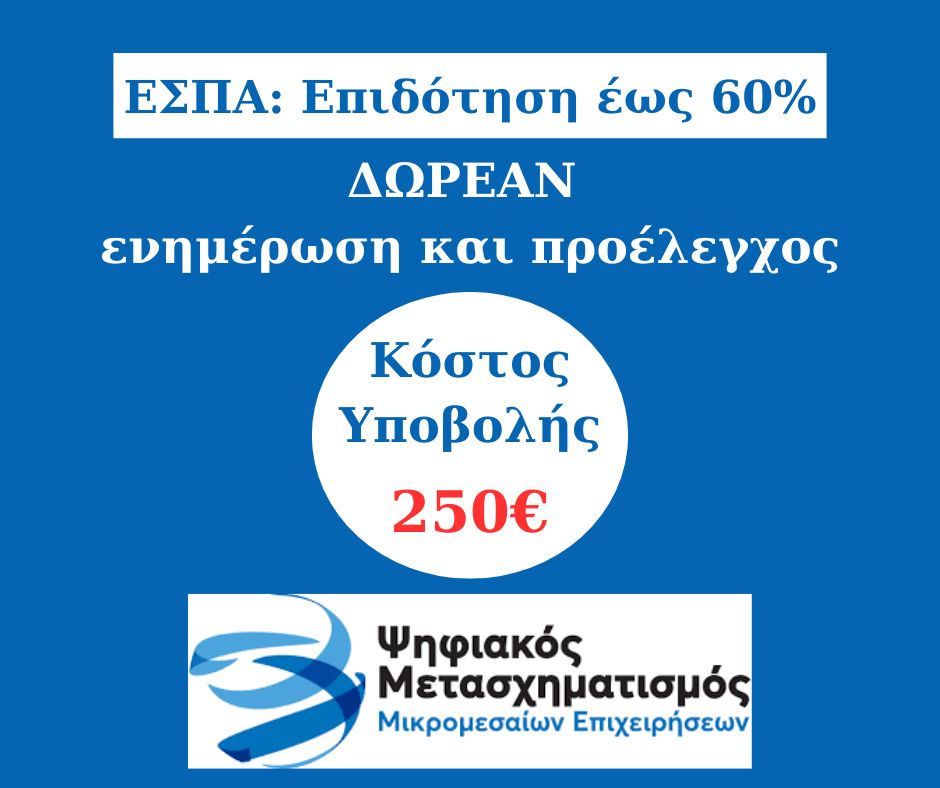 Κόστος υποβολής 250 €. ΕΣΠΑ: Επιδότηση Επιχειρήσεων έως 60%. Ψηφιακός Μετασχηματισμός ΜμΕ