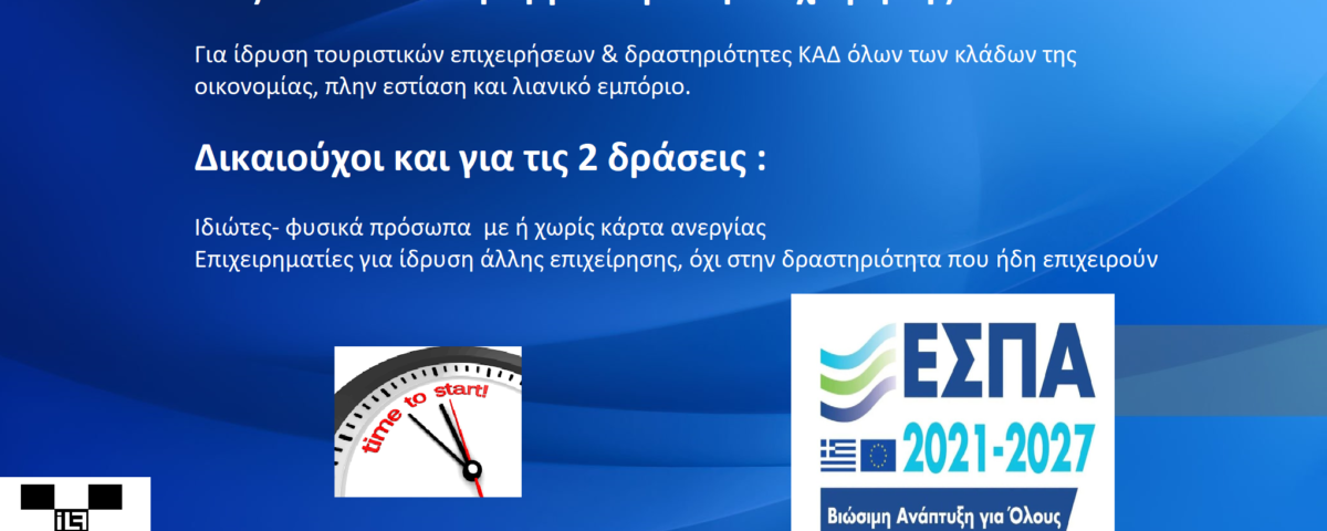 Για ίδρυση τουριστικών επιχειρήσεων & δραστηριότητες ΚΑΔ όλων των κλάδων της οικονομίας, πλην εστίαση και λιανικό εμπόριο.