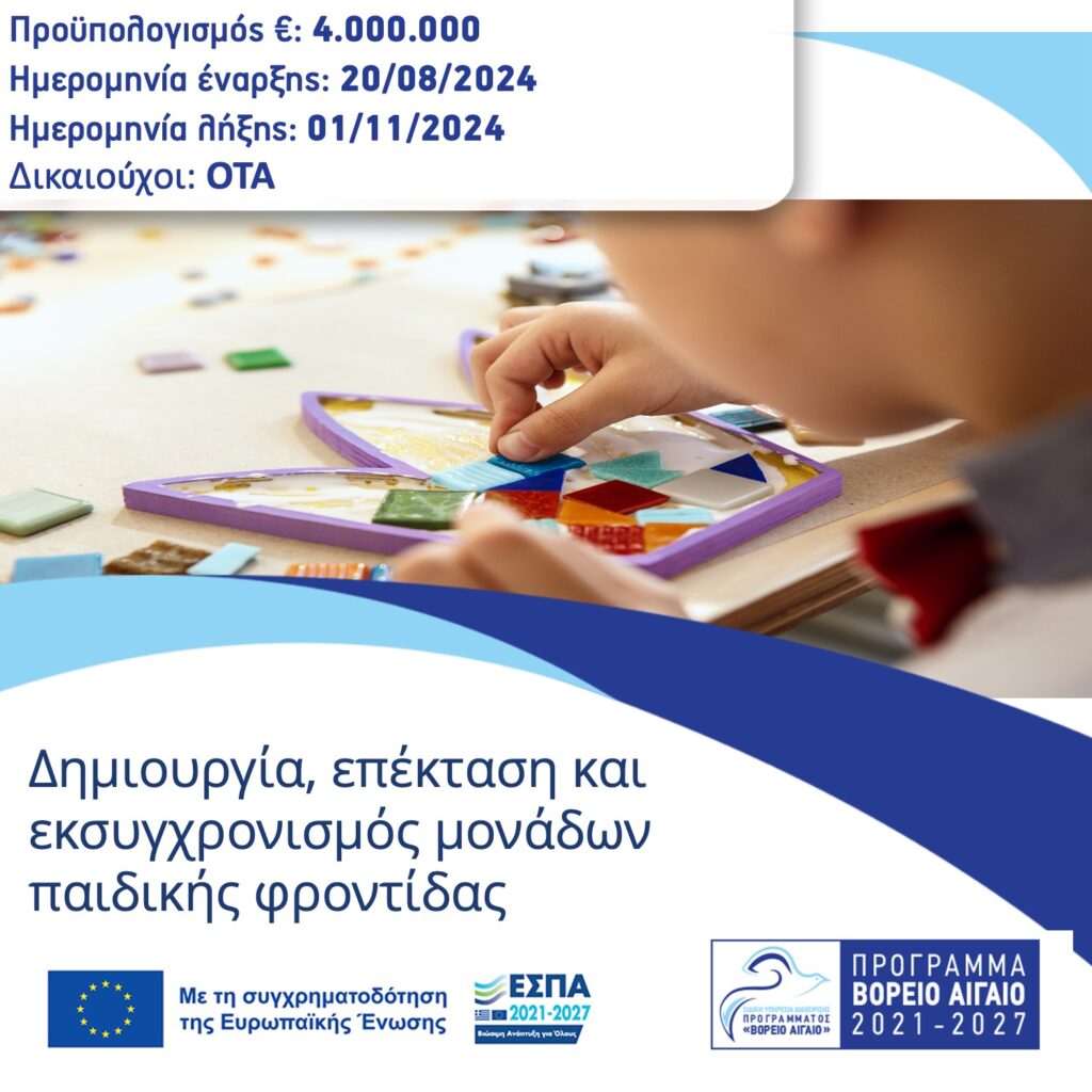 Λαμβάνοντας υπ’ όψη το μεγάλο ποσοστό βρεφών και νηπίων έως τριών ετών της Περιφέρειας Βορείου Αιγαίου, εκτός της επίσημης προσχολικής αγωγής, όπως περιγράφεται αναλυτικά στη στρατηγική του Προγράμματος, είναι διαπιστωμένες οι ανάγκες επέκτασης αλλά και δημιουργίας νέων σύγχρονων υποδομών προσχολικής αγωγής και φροντίδας. Θα πρέπει να είναι κατάλληλα χωροθετημένες στα νησιά της Περιφέρειας, προκειμένου να καλυφθούν οι ανάγκες συμμετοχής των βρεφών και νηπίων έως 3 ετών της Περιφέρειας σε μονάδες παιδικής φροντίδας. Οι εν λόγω εγκαταστάσεις παιδικής φροντίδας, όπως οι βρεφονηπιακοί και οι παιδικοί σταθμοί, είναι σχεδιασμένες για παιδιά από τη γέννηση έως την έναρξη της πρωτοβάθμιας εκπαίδευσης.