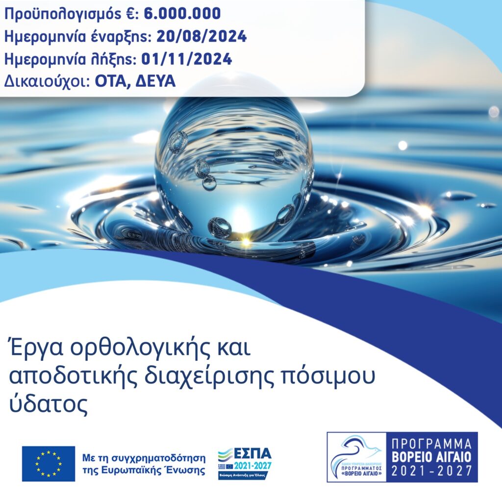 Δικαιούχοι: Δήμοι Περιφέρειας Βορείου Αιγαίου που δεν διαθέτουν ΔΕΥΑ, Δημοτικές Επιχειρήσεις Ύδρευσης – Αποχέτευσης (ΔΕΥΑ) Περιφέρειας Βορείου Αιγαίου