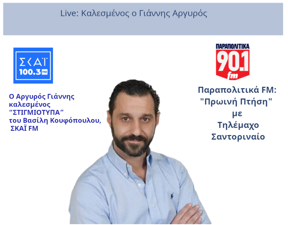 Σήμερα Παρασκευή 27/06/2025 μετά της 21:00 LIVE στο ΣΚΑΙ στην ραδιοφωνική εκπομπή “ΣTIΓMIOTYΠA” με τον Βασίλη Κουφόπουλο. Την Κυριακή 29/06/2025 LIVE στην Πρωινή πτήση ραδιοφωνική εκπομπή με τον Τηλέμαχο Σαντοριναίο.