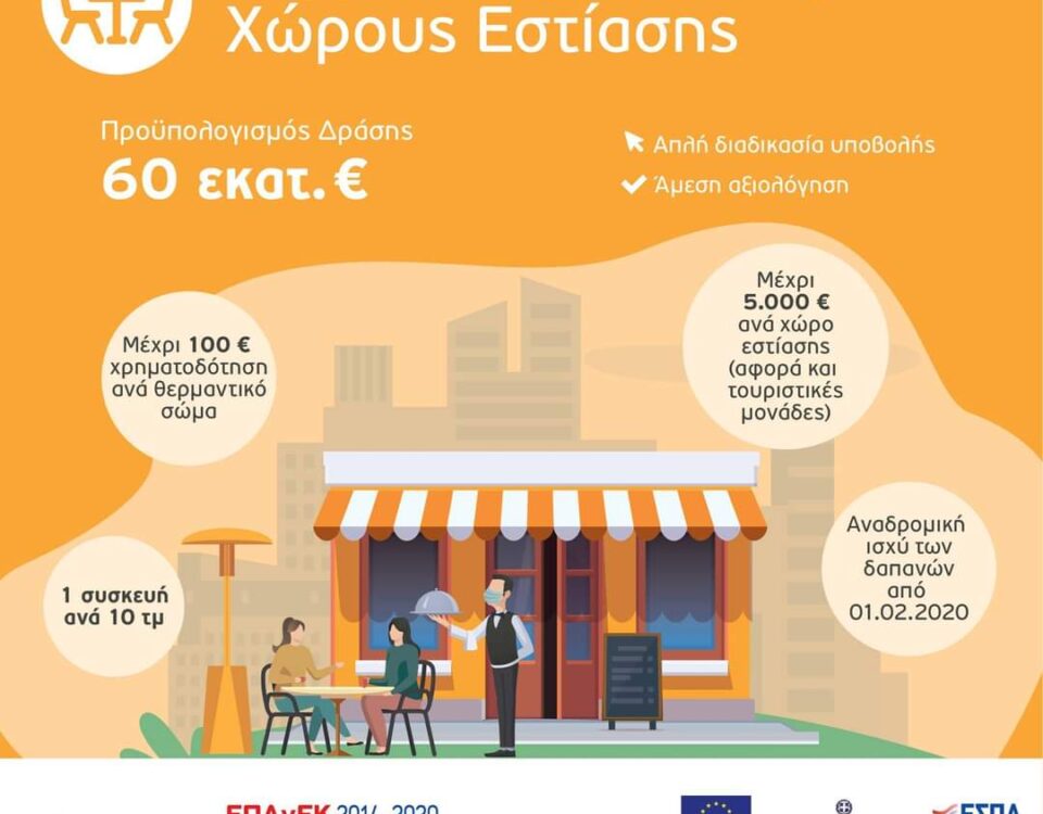 Ενίσχυση έως 5.000 ευρώ για Δραστηριότητες υπηρεσιών εστιατορίων και κινητών μονάδων εστίασης. (Περιλαμβάνονται και όλοι οι ΚΑΔ της υποκατηγορίας 56.10)